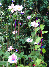 Japanese anemones. sometimes called windflowers. They grow easily and accept all sorts of conditions. Palest of pale pink, tall, and beautiful! I love the way they’ve spread in our garden.