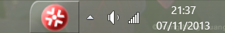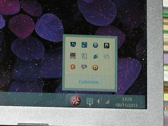 The first button is some kind of message centre that lets me know if there are updates or problems. I dislike the huge button but haven’t quite decided to get rid of it to ‘all apps’. And I think it’s a Lenovo thing rather than imposed by Windows 8. There’s the hidden icons button which I’ll explore in a minute, then volume control, internet connection, and date and time. I shall be coming back to internet connection later when I talk about ‘charms’.