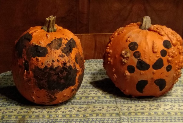 Grandchild is fourteen and tall. Not really the age or size for trick or treating. However, they are autistic and they ‘missed out’ during the pandemic, so were desperate to enjoy this year. Daughter decided that with her participation they could go ahead but in our area, which is comparatively ‘safe’ rather than their own which tends to have more than its fair share of older feral youth. I bring you the results. The costumes were great (and some people thought daughter as dragon was another teen), the dog got a walk (despite the rain) and much candy was obtained. Daughter bought pumpkins at Aldi and chose interesting ones with ‘bumps’ but then found they’d only be able to carve them with a chainsaw so went for black paint instead.