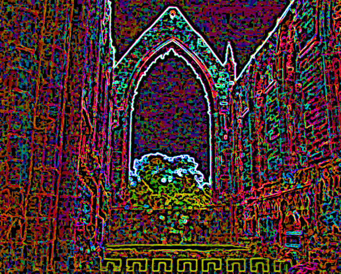 A very photoshopped version of a photo of the big window arch in Bolton Abbey.